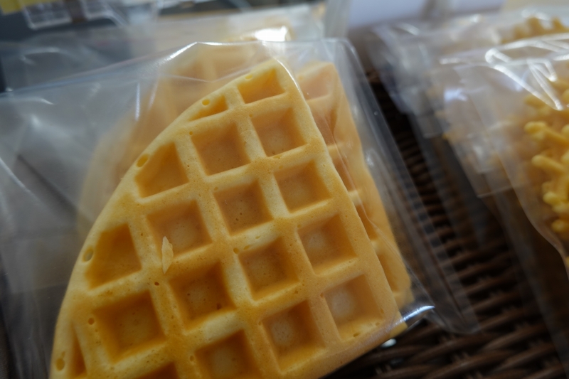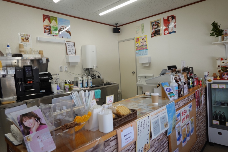 店内にはソフトクリームだけでなく、手作りのスイーツも並びます。注文を受けてから焼き上げる米粉ワッフルに、あんバターやカスタード、チョコホイップなどを挟んで味わえる「ワッフルサンド」(380円)も人気です。さらに「米粉シフォンケーキ」(280円)や「コーヒーゼリー」(450円)なども数量限定で販売しています。