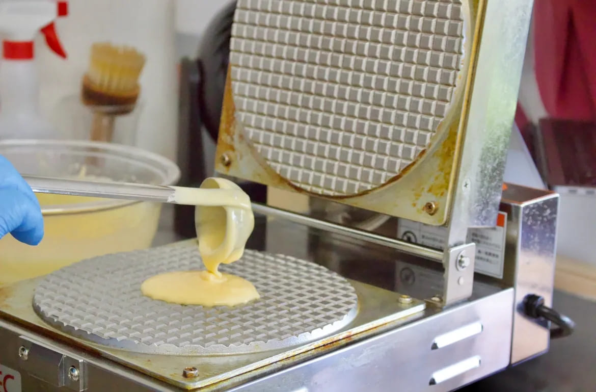 看板メニューは「ソフトクリーム」(ミニサイズ 250円~、 大サイズ420円)。お店自慢のワッフルコーンは大衡村で作られた米粉を使用し、粉の製造から生地づくり、焼き上げまで店内で行っています。米粉ならではの軽やかでサクッとした食感、噛むほどに広がるほのかな甘みと香ばしさにファンも多い一品です。